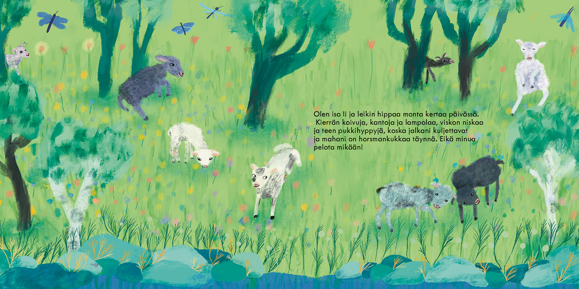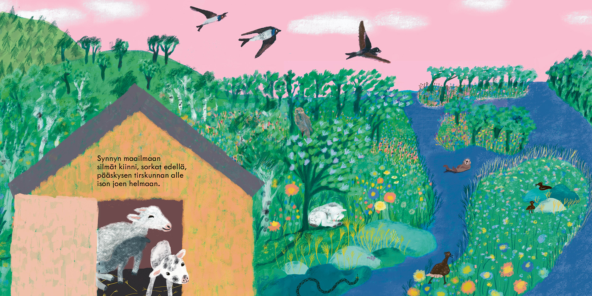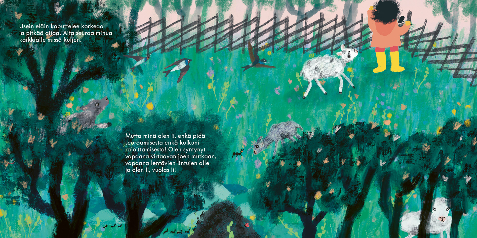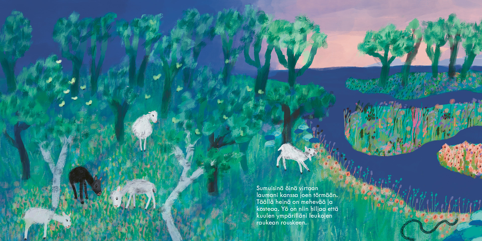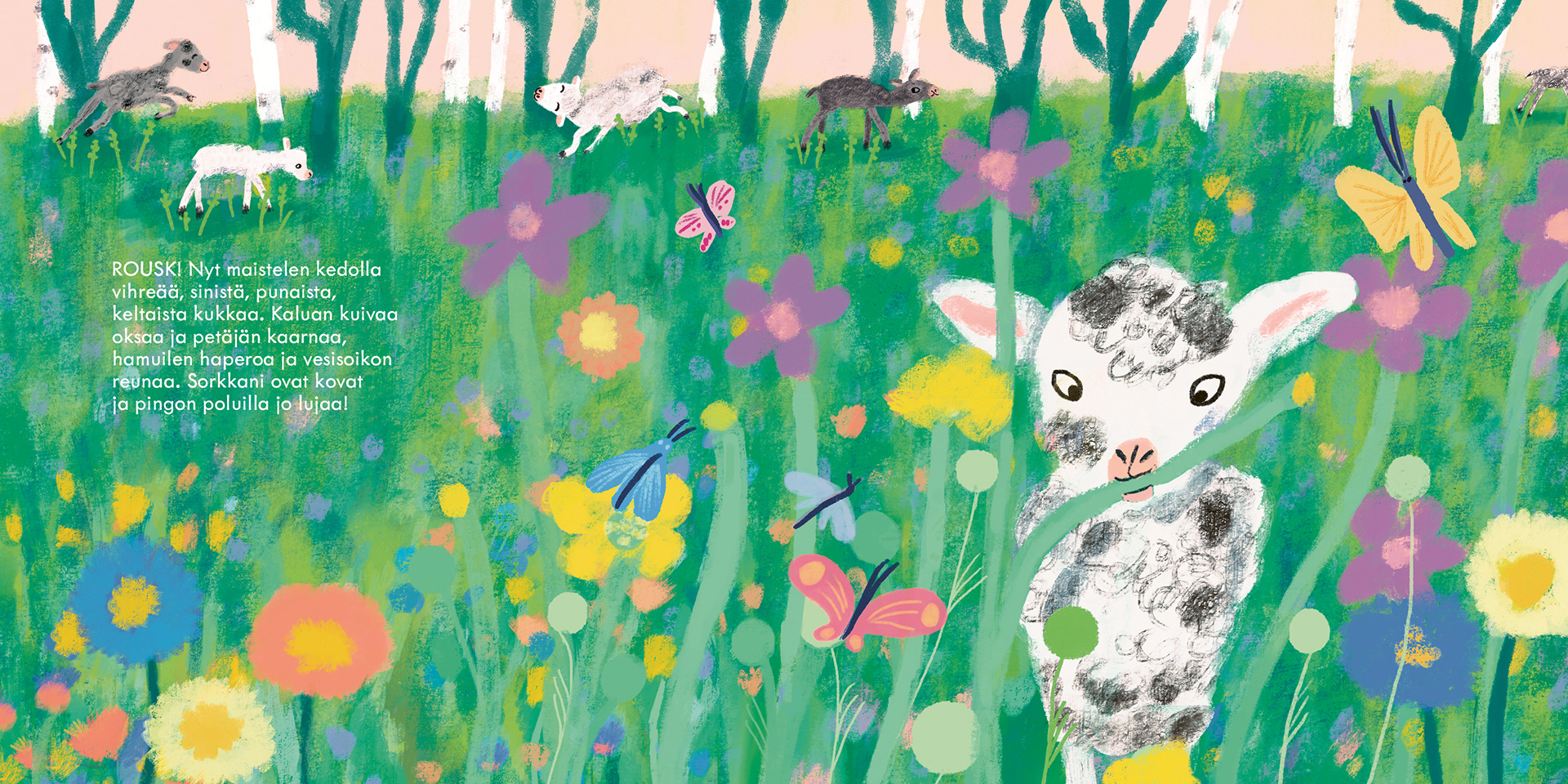 The book introduces the Saukonmutka Stories series of lamb books by Meiju Niskala. The stories were born on Niskala’s beloved farm by the Iijoki River, where she lives alongside her own flock of sheep. The series is grounded in a strong posthumanist philosophical perspective, through which Niskala aims to foster understanding and empathy for other-than-human beings.