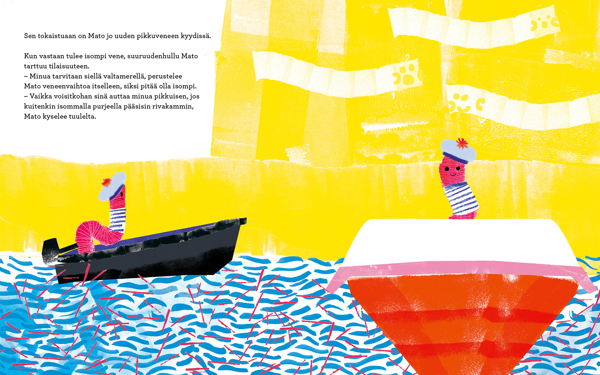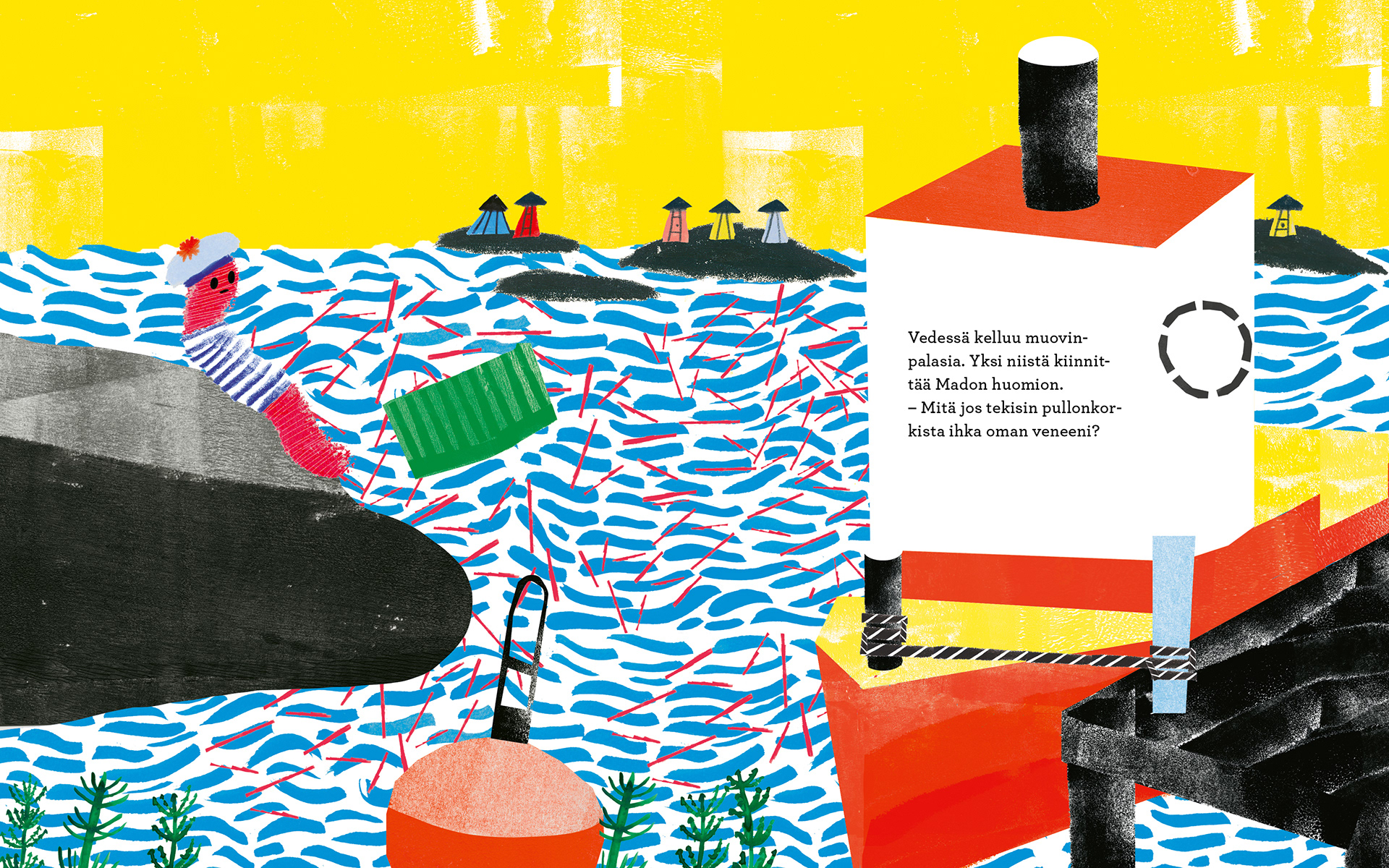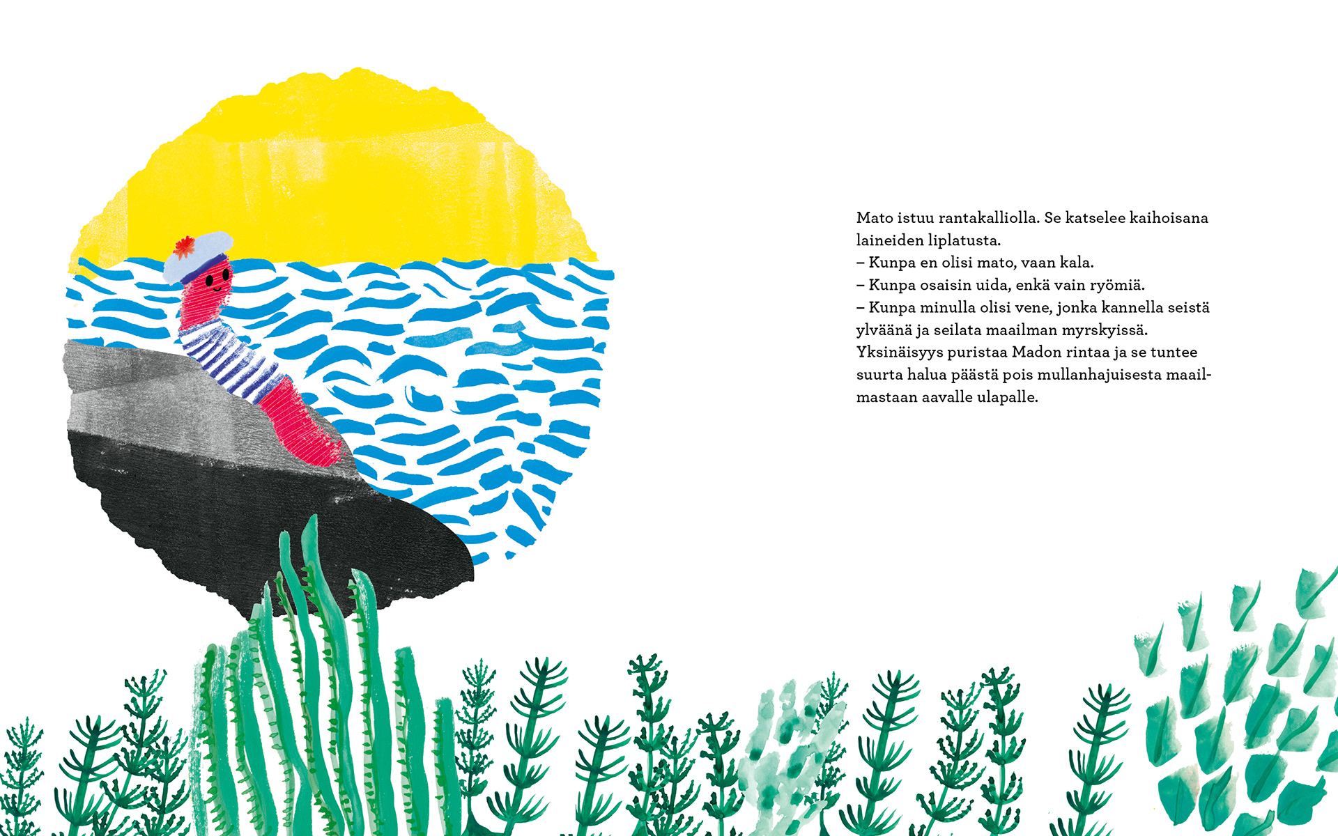 Worm sits on a rocky shore, longing for distant places. When a plea for help arrives in a bottle washed up on the beach, Worm’s great adventure across the ocean begins. But he becomes blinded by speed, always wanting a bigger and faster boat. Only when Worm meets the yellow fish who sent the message for help do his eyes truly open.