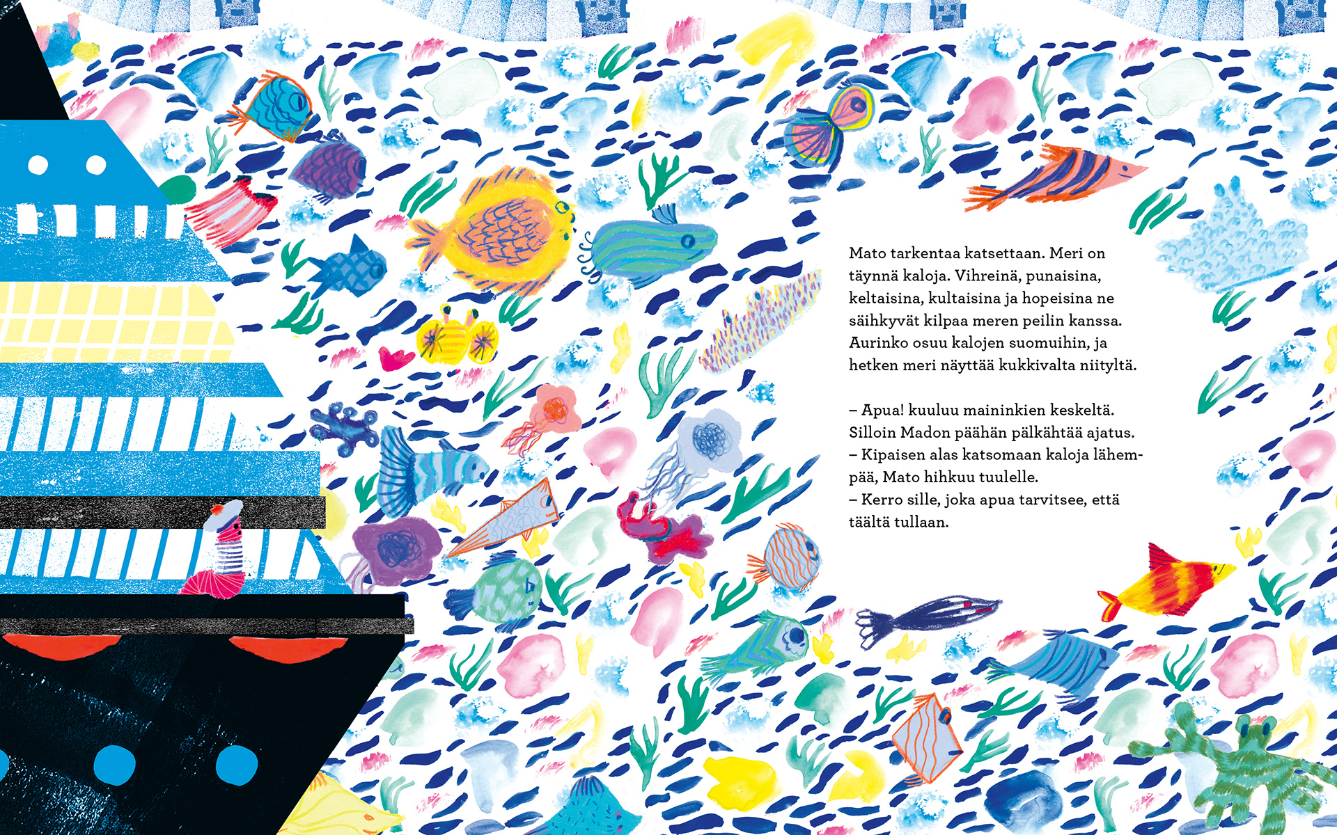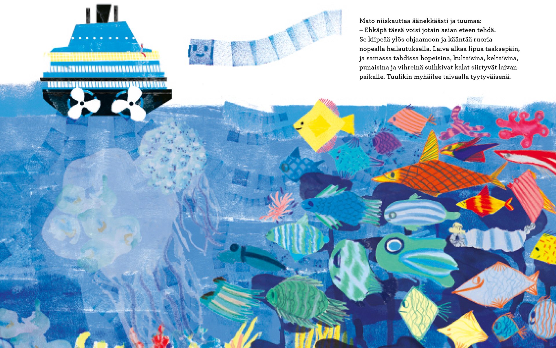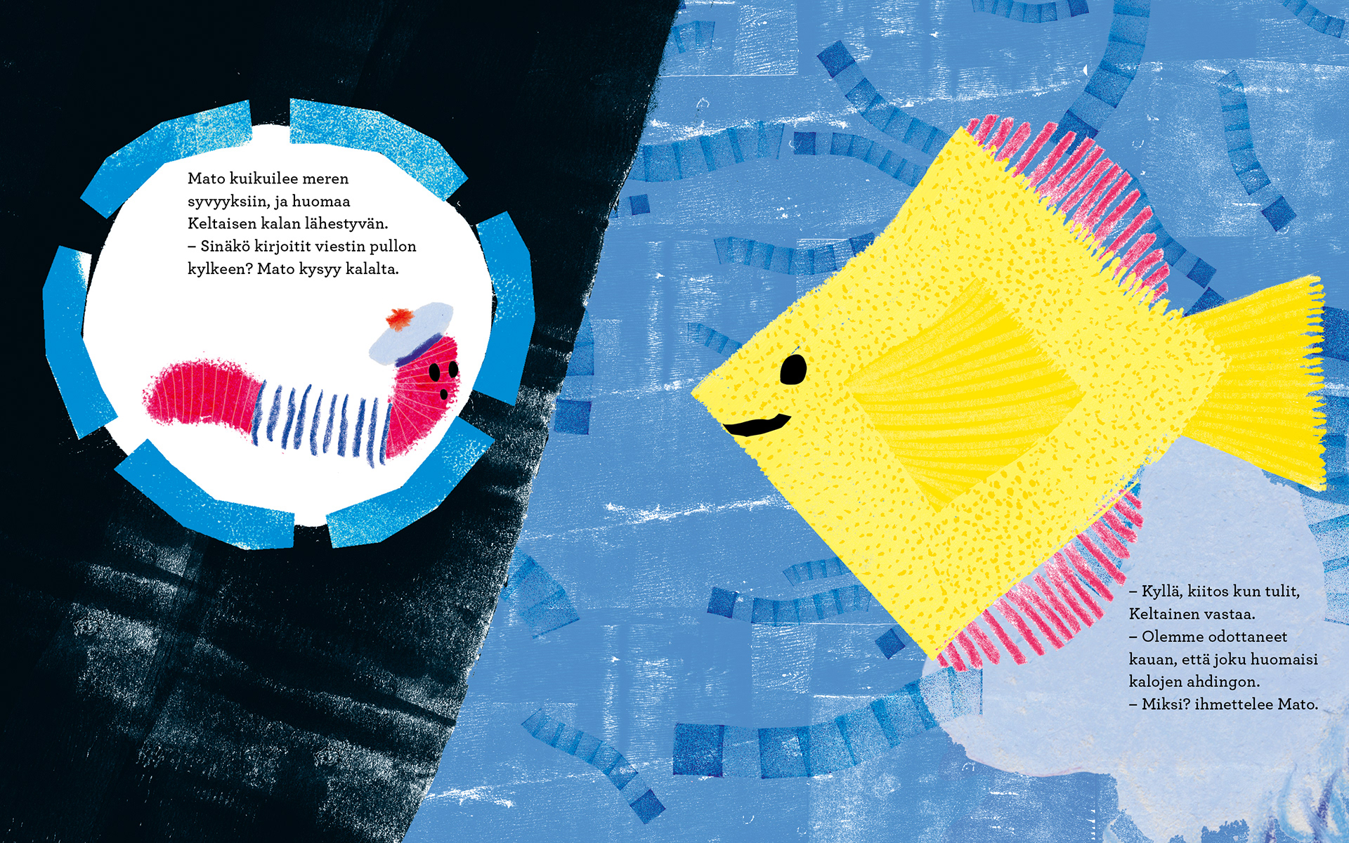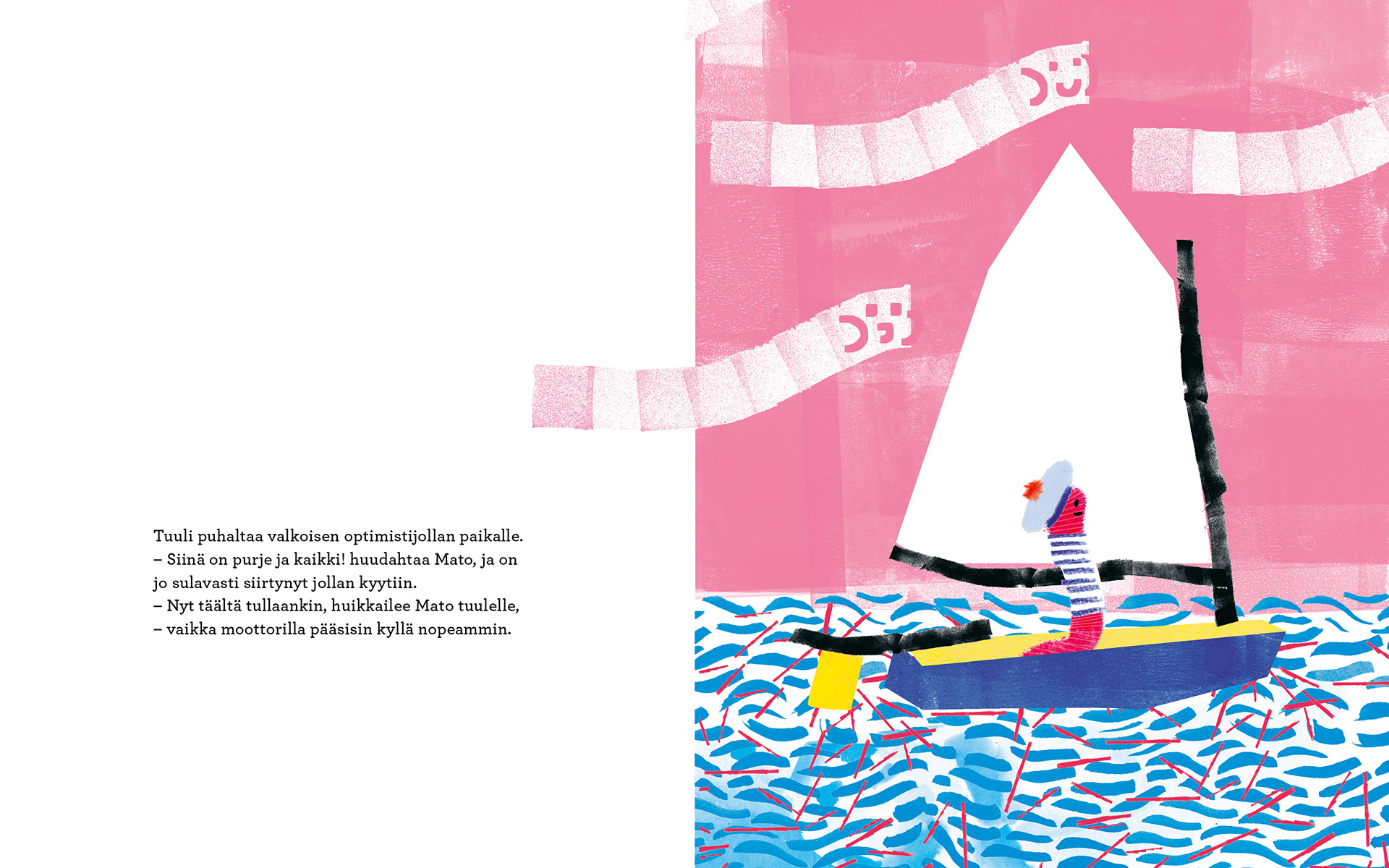 Worm sits on a rocky shore, longing for distant places. When a plea for help arrives in a bottle washed up on the beach, Worm’s great adventure across the ocean begins. But he becomes blinded by speed, always wanting a bigger and faster boat. Only when Worm meets the yellow fish who sent the message for help do his eyes truly open.